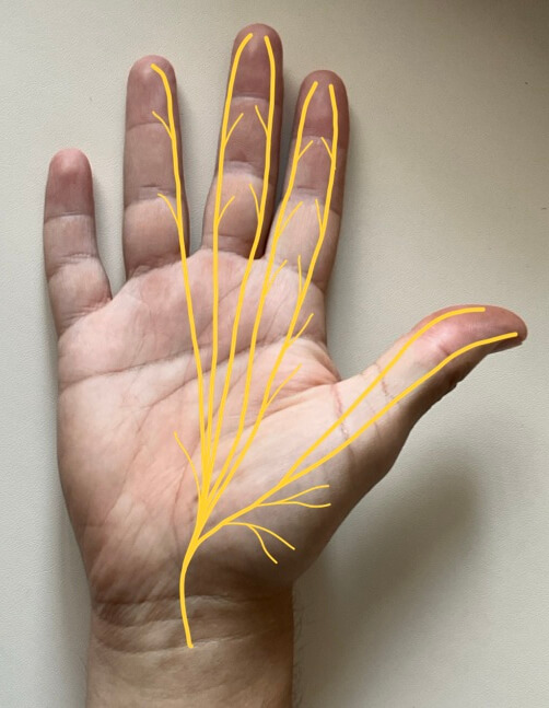 Doch warum sind genau die drei und nicht die anderen Finger betroffen? Beim Karpaltunnelsyndrom kommt es zu einer Kompression des Nervus medianus. Genau dieser Nerv versorgt hauptsächlich die Hand innenseitig (nicht den Handrücken) und verläuft im Bereich des Daumens, Zeige-, Mittel- und teilweise Ringfingers.
