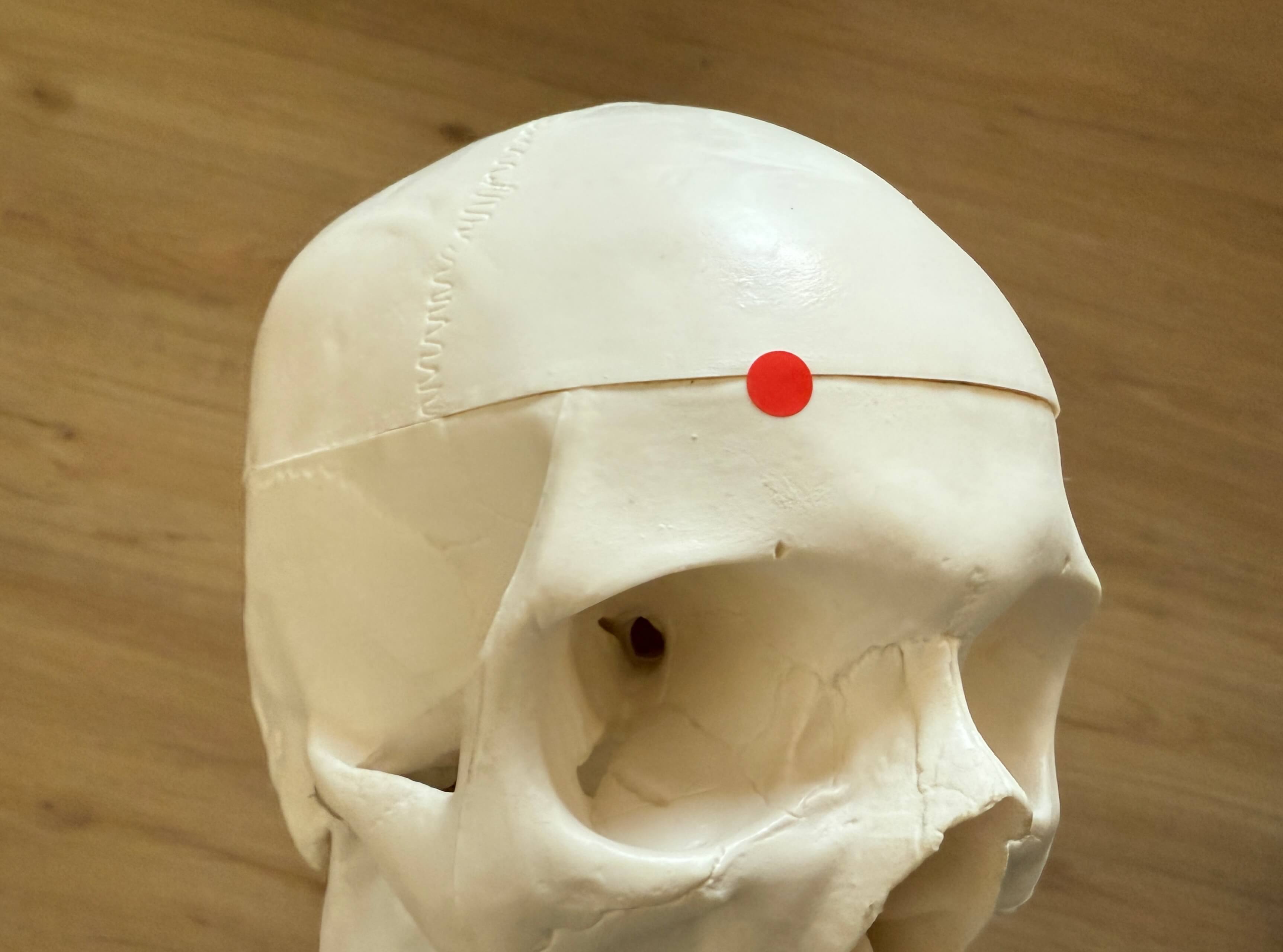 Den Punkt findet man am leichtesten, wenn der Blick nach vorn verläuft. Dann befindet sich der Punkt oberhalb der Pupille und etwa einen Daumen breit mittig der Augenbraue.